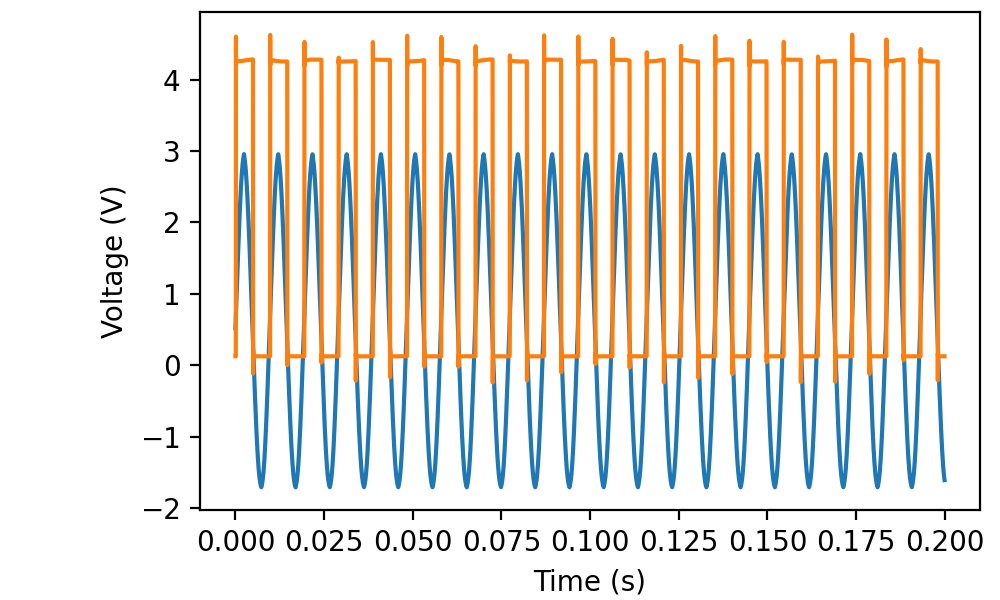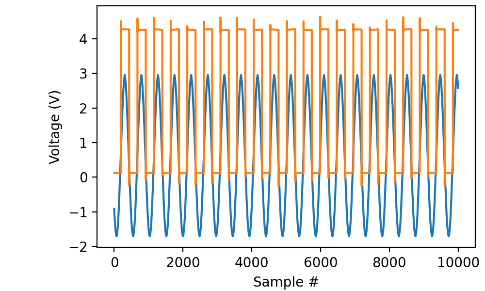 Read 200 ms worth of data from channels “ai0” and “ai1” with a sampling frequency of 50 kilohertz and display the results using matplotlib: