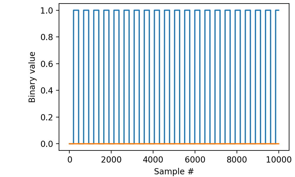 Read 200 ms worth of data from channels “di0” and “di1” with a sampling frequency of 50 kilohertz and display the results using matplotlib:
