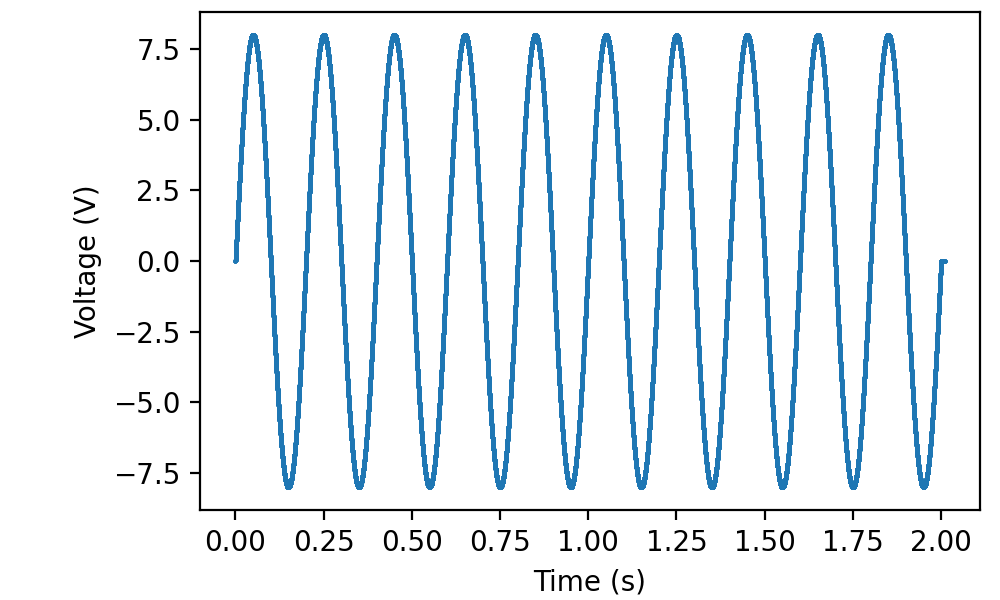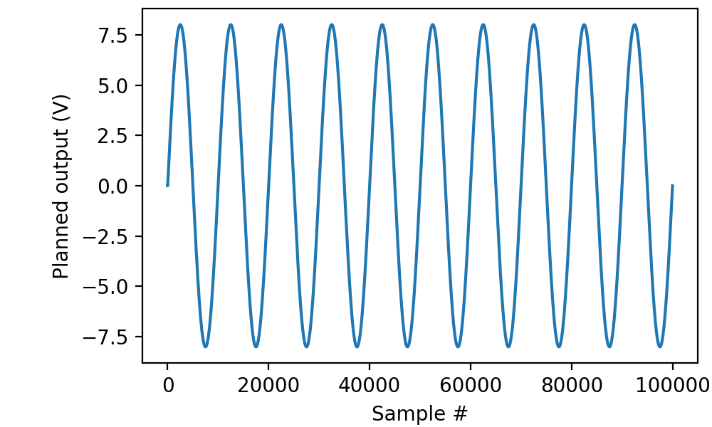 Like advanced traditional function generators, PicoDAQ can store arbitrary waveforms, and this is the most convenient way to produce sine wave output. The first step is to define the sine wave itself with a little numpy magic: