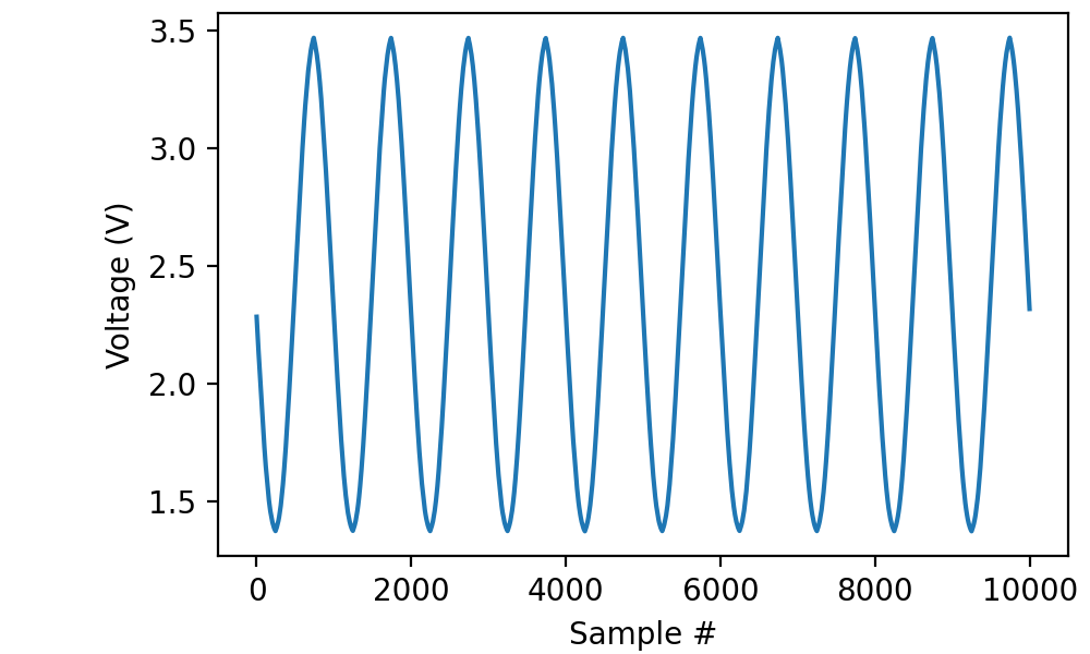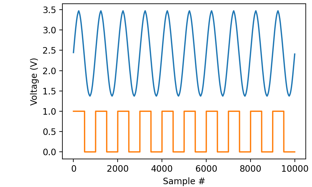 In this case I opted not to record the digital signal, but you can tell from the phase of the sine wave that we triggered on the falling slope of the digital signal.