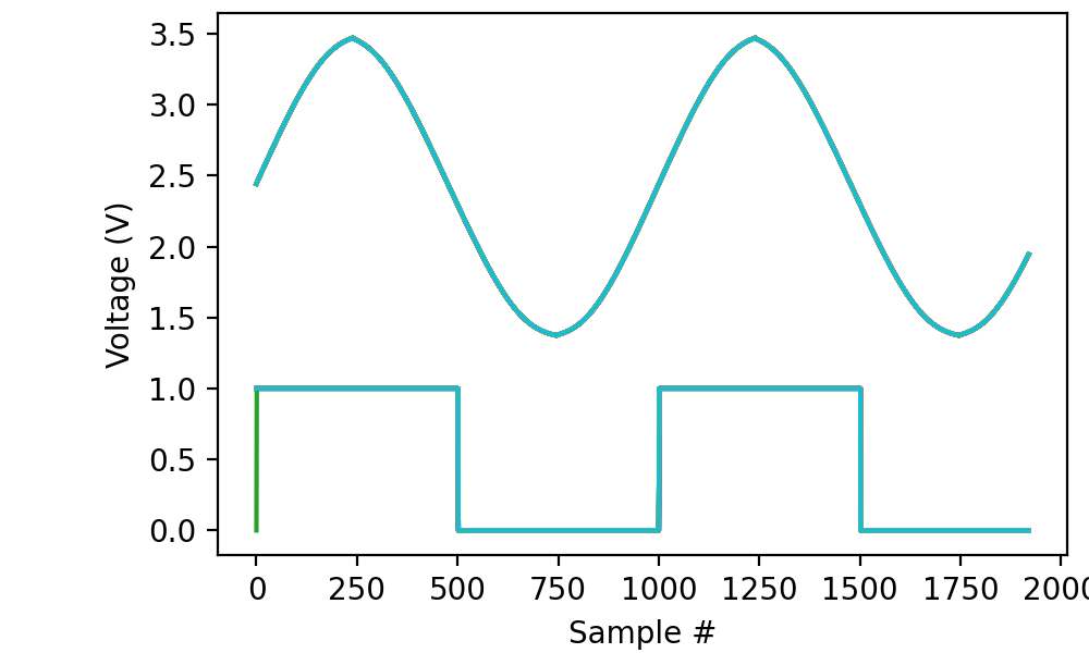 In this case, we wait until digital line “di0” goes high before recording 100 milliseconds from both “ai0” (connected to the main output of a function generator) and “di0” (connected to the TTL gate of the same function generator).